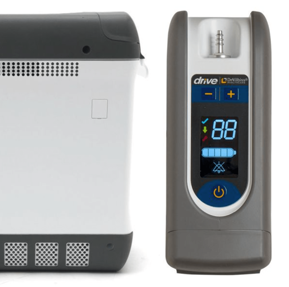 The Drive iGo®2 is a 4.95 lb portable oxygen concentrator with pulse flow settings 1–5 and up to 3.5 hours of battery life at setting 2, ideal for active lifestyles.